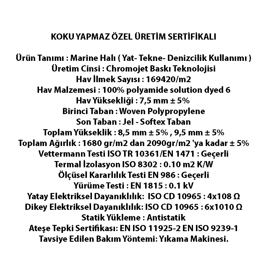 Ürün Tanımı : Marine Halı ( Yat- Tekne- Denizcilik Kullanımı ) Üretim Cinsi : Chromojet Baskı Teknolojisi Hav İlmek Sayısı : 169420/m2 Hav Malzemesi : 100% polyamide solution dyed 6 Hav Yüksekliği : 7,5 mm ± 5% Birinci Taban : Woven Polypropylene Son Taban : Jel – Softex Taban Toplam Yükseklik : 8,5 mm ± 5% , 9,5 mm ± 5% Toplam Ağırlık : 1680 gr/m2 dan 2090gr/m2 ‘ya kadar ± 5% Vettermann Testi ISO TR 10361/EN 1471 : Geçerli Termal İzolasyon ISO 8302 : 0.10 m2 K/W Ölçüsel Kararlılık Testi EN 986 : Geçerli Yürüme Testi : EN 1815 : 0.1 kV Yatay Elektriksel Dayanıklılık: ISO CD 10965 : 4×108 Ω Dikey Elektriksel Dayanıklılık: ISO CD 10965 : 6×1010 Ω Statik Yükleme : Antistatik Ateşe Tepki Sertifikası: EN ISO 11925-2 EN ISO 9239-1 Tavsiye Edilen Bakım Yöntemi: Yıkama Makinesi.